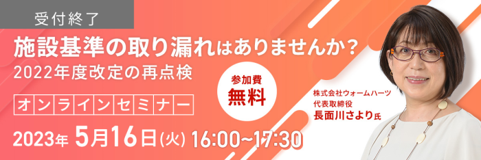 講師に長面川さより氏をお迎えし、2022(令和4年)年度診療報酬改定で新設された施設基準で見落としがちなポイントや、新しい施設基準の取得漏れ、届出漏れがないか再確認のポイントを解説します。