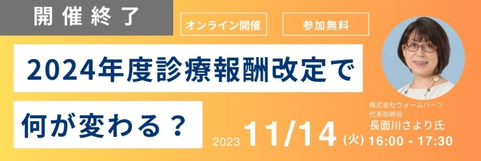 当セミナーでは、講師に長面川さより氏をお迎えし、2024年度(令和6年度)診療報酬改定の最新情報をもとにポイントを整理、改定の見通しと注意点をわかりやすく解説します。