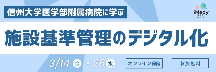 無料オンライン事例セミナー/「信州大学医学部附属病院に学ぶ、施設基準管理のデジタル化」を開催します〔主催:iMedy(株)〕